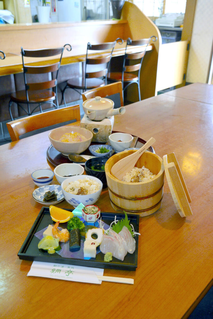 鮮度抜群の鯛を豪快な切り身にして、昆布出汁と醤油で炊き上げた「鯛めしDX(写真手前1,800円)」と、ぷりっとした肉厚の身を熱々でいただく「鯛茶漬(1,500円)」。