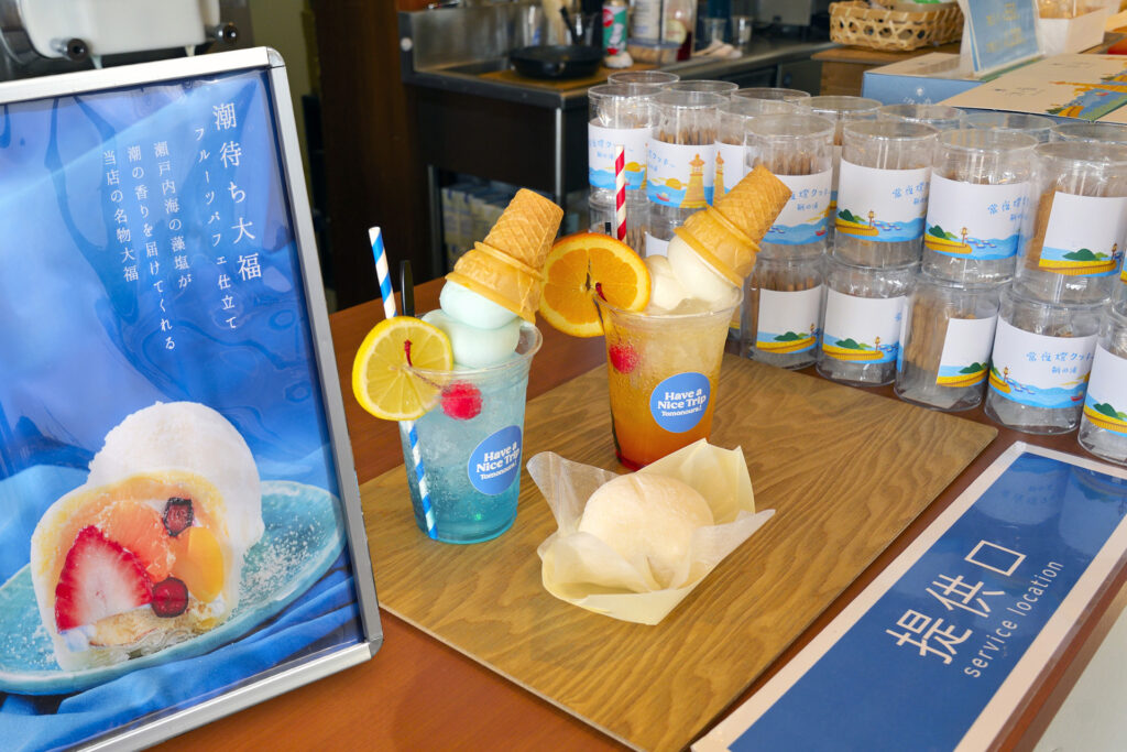 特製塩クリームと苺、みかん、栗、フランポワーズ、ブルベリーを包んだ「潮待ち大福(680円)」と「鞆ソーダフロート(780円)左:レモネード(海)、右:オレンジ(夕焼け)」。