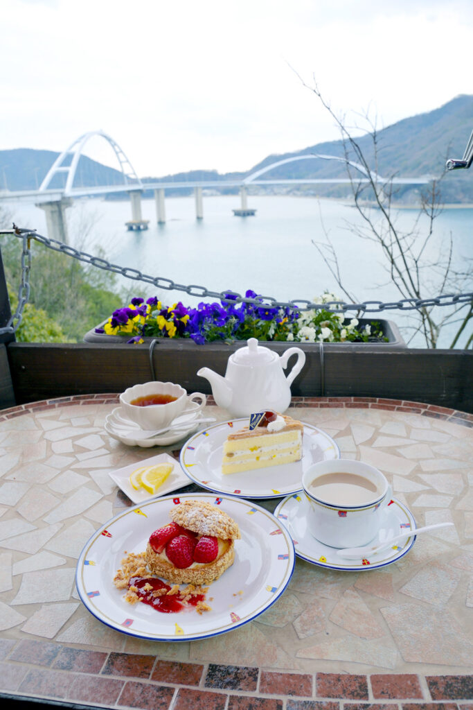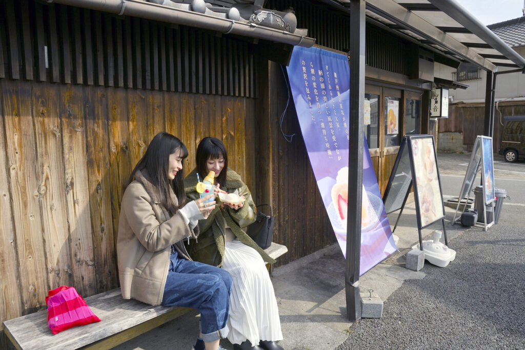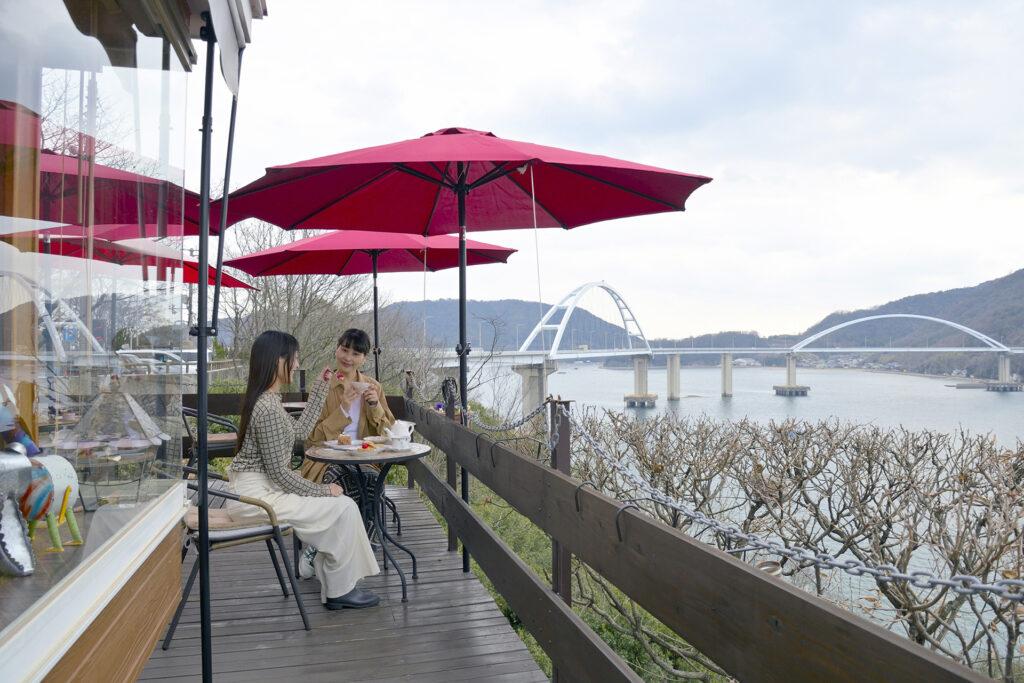 鞆の浦を歩き疲れた頃、自然と足が向いてしまう甘味処。店先の正面には、鞆の浦の美しい海や常夜灯が。瀬戸内海の海水から作られた塩を使った塩豆大福(350円)や塩クリーム大福(350円)のほか、海や夕焼けをモチーフにしたスイーツも揃います。