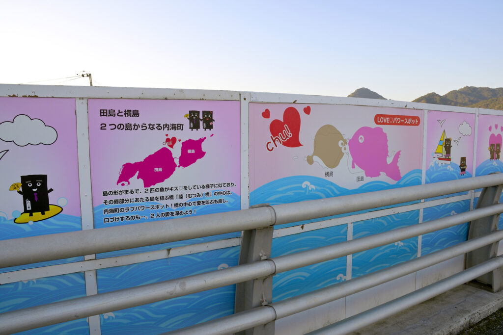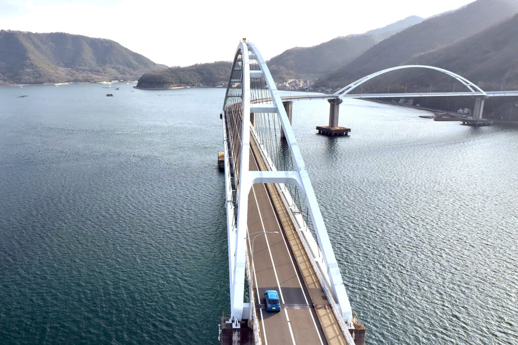 海面から30メートル。全長832m、特徴的な曲線が瀬戸内海を彩る「内海大橋」を下から見上げるとそのスケールに圧倒されます。青空を背に描く弧が、瀬戸内海の多島美と美しく調和。