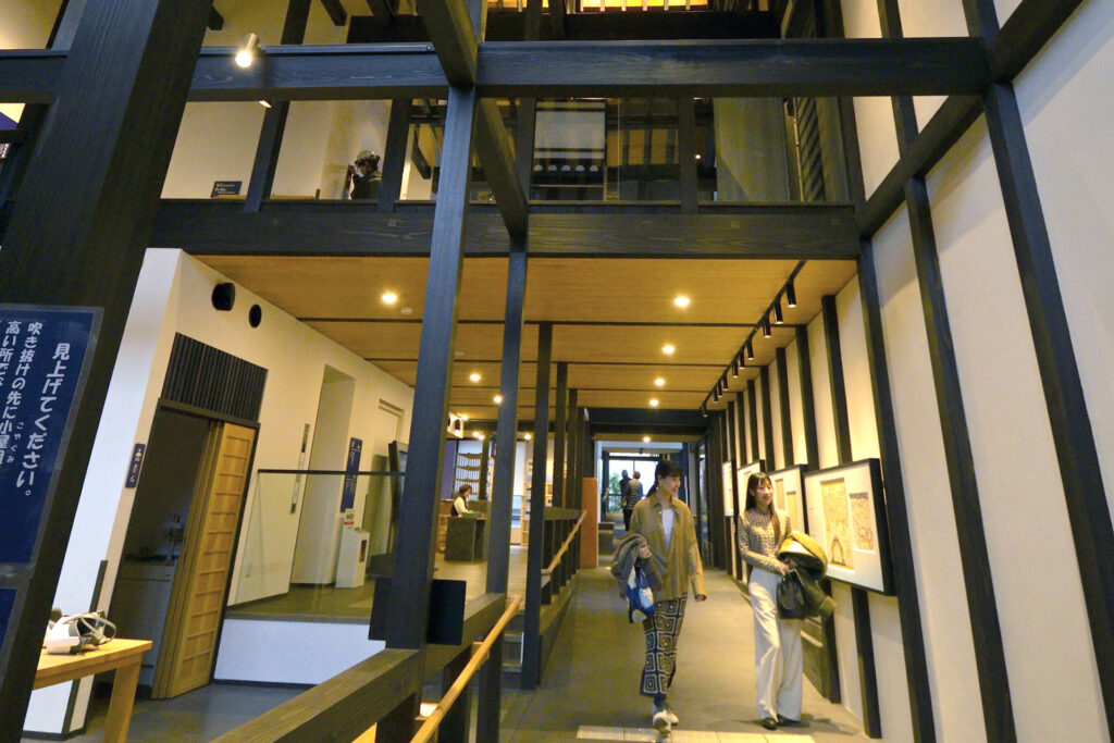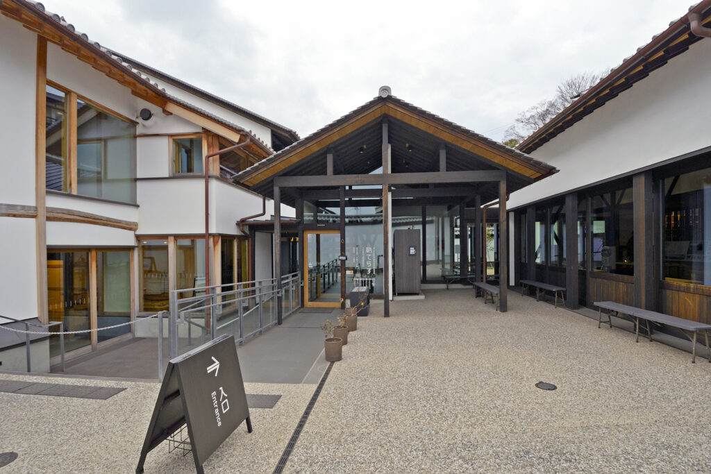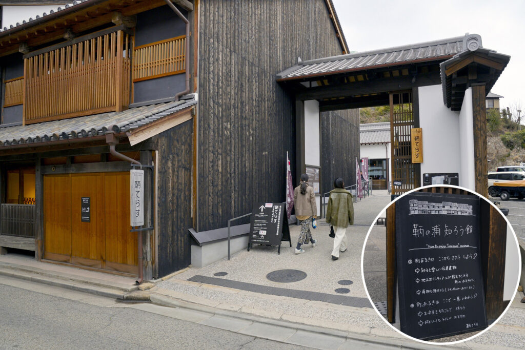 鞆の浦に着いたら、まずは「鞆てらす」へ。明治時代の町家を活用したこの施設は、誰もが気軽に立ち寄れる、鞆の浦散歩の拠点。町の歴史や文化を知ることで、旅がぐっと奥行きを増します。看板には、『何といってもトイレがおすすめ』の一言にも、思わず笑顔に(円写真)。