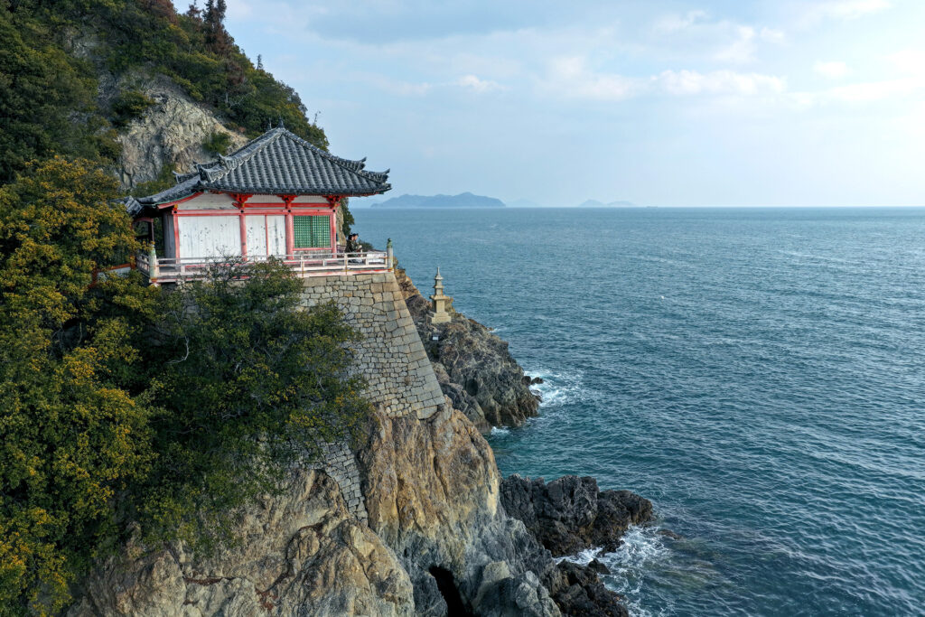 1570〜1573年に、毛利輝元によって再建された磐台寺の観音堂。古くからその美しさは名高く、安藤広重の浮世絵や志賀直哉の小説『暗夜行路』にも描かれています。