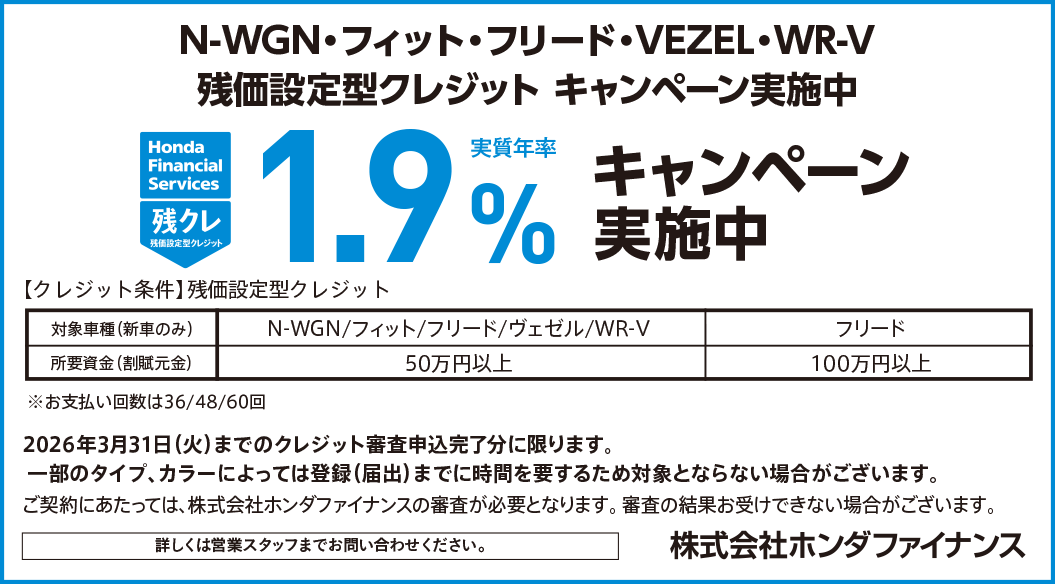 【残クレお支払い例について】 ●上記お支払い例は2026年2月の一例です。 ●上記お支払い例は、初回お支払い月を2026年2月で計算した一例です。 ☆Honda残価設定型クレジットは最終回に、①新車に乗り換え、②乗り続ける(最終回お支払い額を一括または再クレジットでお支払い)、③車両を返却 のいずれかをお選びいただけます。①、③の場合、内外装キズや走行距離などの確認事項があります。事前に定めた条件を超える場合には、その差額分を別途ご負担いただきます。詳しくは営業スタッフまでお問合せください。