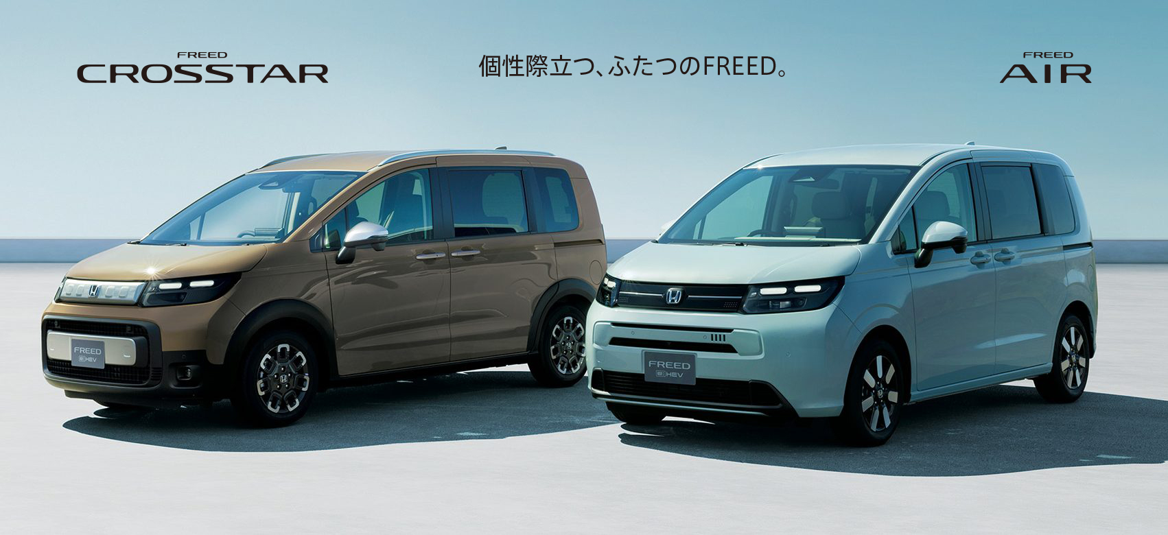 Photo(左):FREED e:HEV CROSSTAR(FF/5人乗り) ボディーカラーはデザートベージュ・パール(有料色:38,500円高) ディーラーオプション(11.4インチ Honda CONNECTナビ LXM-247VFLi:310,200円)装着車 Photo(右):FREED e:HEV AIR EX(FF/6人乗り) ボディーカラーはフィヨルドミスト・パール(有料色:38,500円高) メーカーオプション(マルチビューカメラシステム、LEDアクティブコーナリングライト、アダプティブドライビングビーム、後退出庫サポート:119,900円高)、ディーラーオプション(11.4インチ Honda CONNECTナビ LXM-247VFLi:310,200円) 装着車